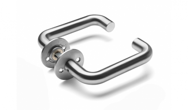 Lever handle 16 mm U shape, pair, 8x8mm, solid ball bearing rose cc 30 mm, for door thickness 33-59 mm, satin stainless steel AISI 316, Lever supplied with M4 x75 mm section bolts and fixing bush