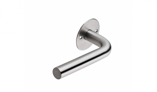 Lever handle 16 mm L shape, pair, 8x8mm, solid rose cc 30 mm, for door thickness 33-59 mm, satin stainless steel AISI 304, Lever supplied with M4x110 mm and M5x39 mm screws