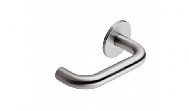 Lever handle 16 mm U shape, pair, 8x8mm, snap on cover rose cc 30/38, for door thickness 59-85 mm, satin stainless steel AISI 304, Lever supplied with M4x110 mm and M5x39 mm screws