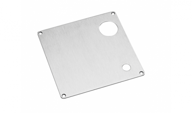 Square back plate, 175x175x2mm f/ASSA, with 2 x ø40 mm hole for cylinder ring, right, X=111 mm, satin stainless steel AISI 304