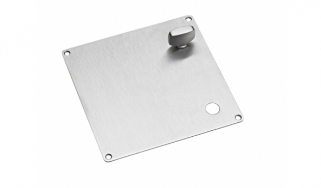 Square back plate, 175x175x2mm f/ASSA, with lever hole and thumb turn, right, X=105 mm, satin stainless steel AISI 304